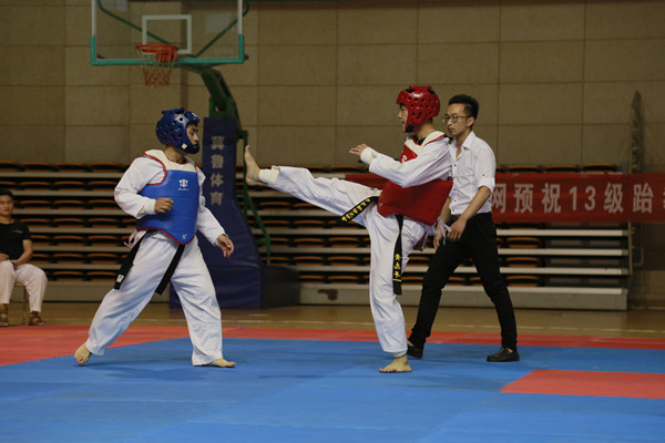 “进攻,出腿……”“加油、加油,注意防守,拉开距离。”一声声加油助威从体育馆传来,这里正在举行一场跆拳道比赛。6月16日晚,beat365英国官网网站2013级跆拳道专选班的毕业比赛在体育馆篮球场举行。体育学院副院长章翔、党总支副书记周多奇等观看了此次比赛。