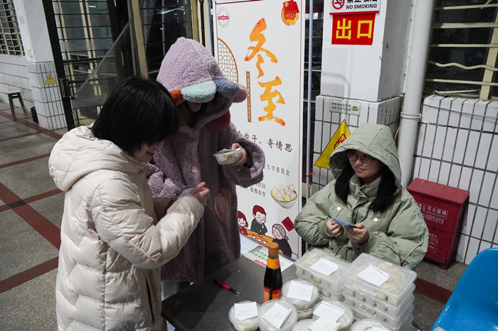 “请问我可以领取一盒水饺吗?”当晚8时左右,汉语言文学专业2020(6)班的王蔚玲前来食堂领取到了第一份水饺。拿到水饺后,她便在食堂中落座品尝。“水饺很好吃,同学们还很贴心地为我们准备了醋!”她对手中这份免费水饺不停“点赞”。“冬至时因为学业繁忙没能吃上一份水饺,今夜算是弥补了一些遗憾,很感谢这些同学亲手制作的水饺!”