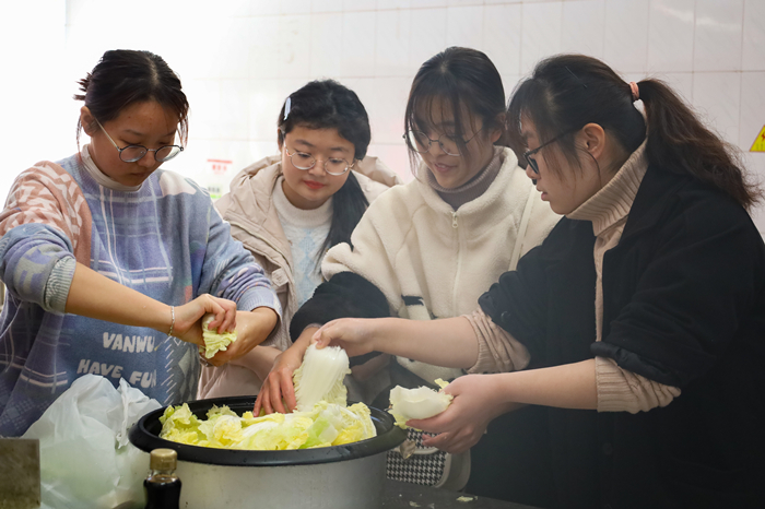 为了让水饺品尝起来更加鲜美,成员们还特意向食堂师傅“取经”。“三勺盐、一勺糖、适量生抽……”在参考食堂师傅的“秘方”后,一盆馅料的调味便制作完成。“为了锁住鲜肉中的汁水,师傅还特意强调我们要顺着一个方向为其‘上劲’,从中学习到了很多美食制作的知识。”指挥分工、处理材料、制作馅料……作为水饺制作“主力军”,汉语言文学专业2020(3)班的李馨怡表示尽管最初“操刀”时有些陌生,但她在参照食谱与食堂师傅的指导后逐渐熟练,在周围同学遇到制作困难时还会进行现场教学。