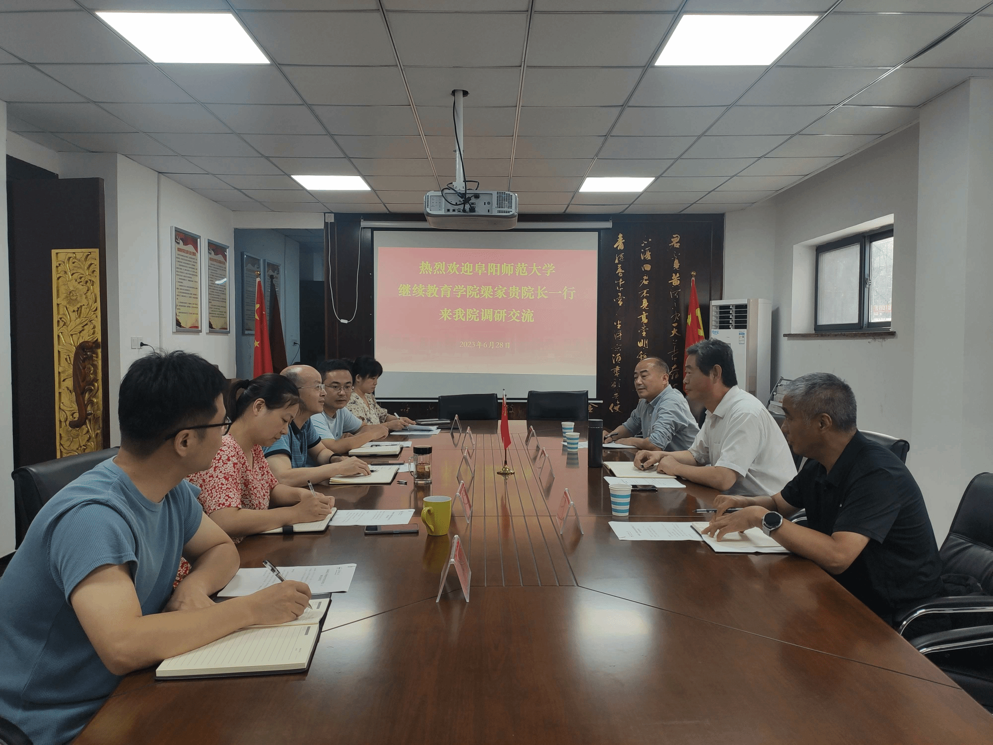 6月28日,阜阳师范大学继续教育学院院长梁家贵、副院长张宇一行来beat365官网调研交流继续教育工作,继续教育学院院长韦长发、副院长代花等热情接待了梁家贵一行。
