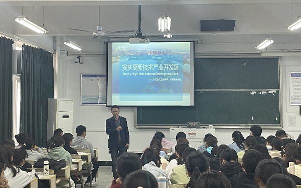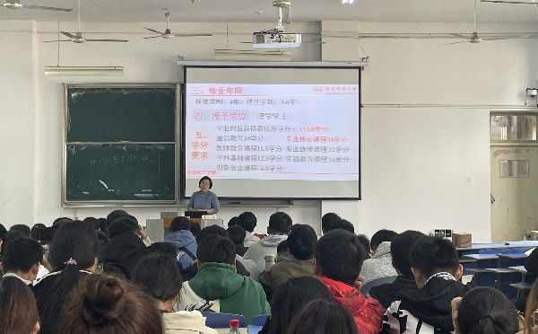 材料化学专业负责人从提问引入专业介绍主题。她围绕材料化学专业简介、人才培养方案、专业师资力量以及该专业的就业与深造等四个方面进行阐述,通过创设日常生活情境、列举数字进行比较、讨论材料化学专业知识以及援引专业著名学者的相关介绍,对材料化学专业进行了全方位、多层次、立体化的介绍。化学工程与工艺专业负责人从化学工程与工艺专业是什么、如何成为化学工程与工艺专业的专业人才、本专业就业与考研情况三个方面介绍了专业情况。化工新材料产业学院(研究院负责人分别向两个专业同学分析了安庆高新技术产业开发区战略定位、政策支撑以及区位优势,鼓励同学们不断提升专业本领,站上更好的“赛道起跑点”,留在高新区,留在安庆就业创业。