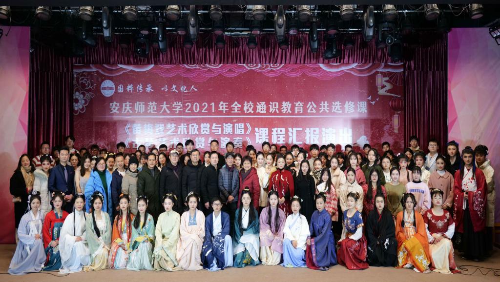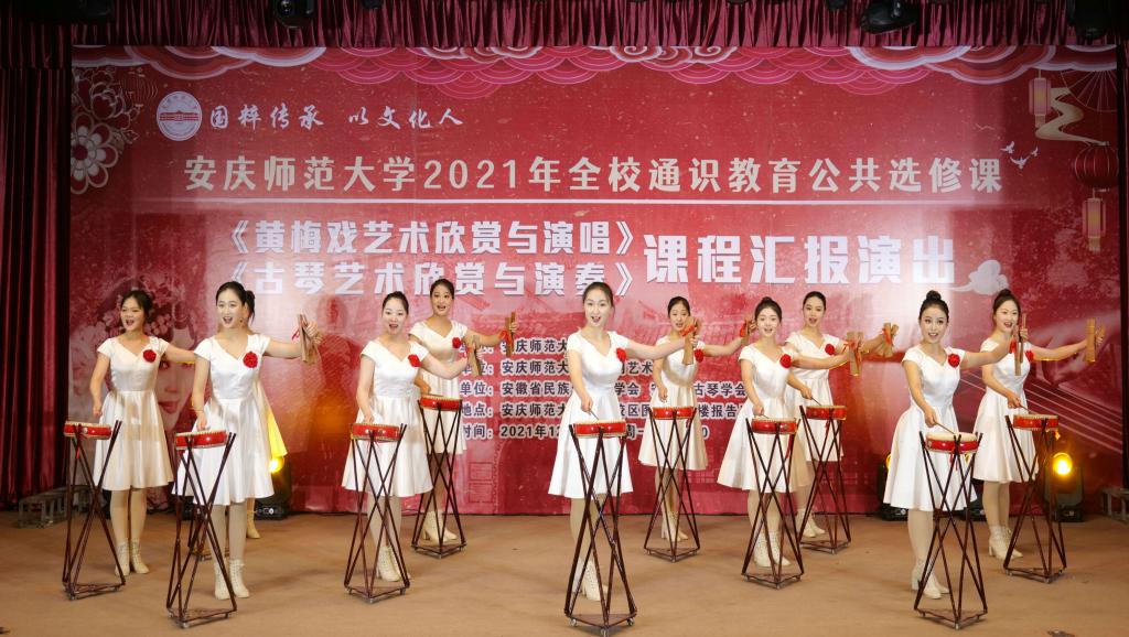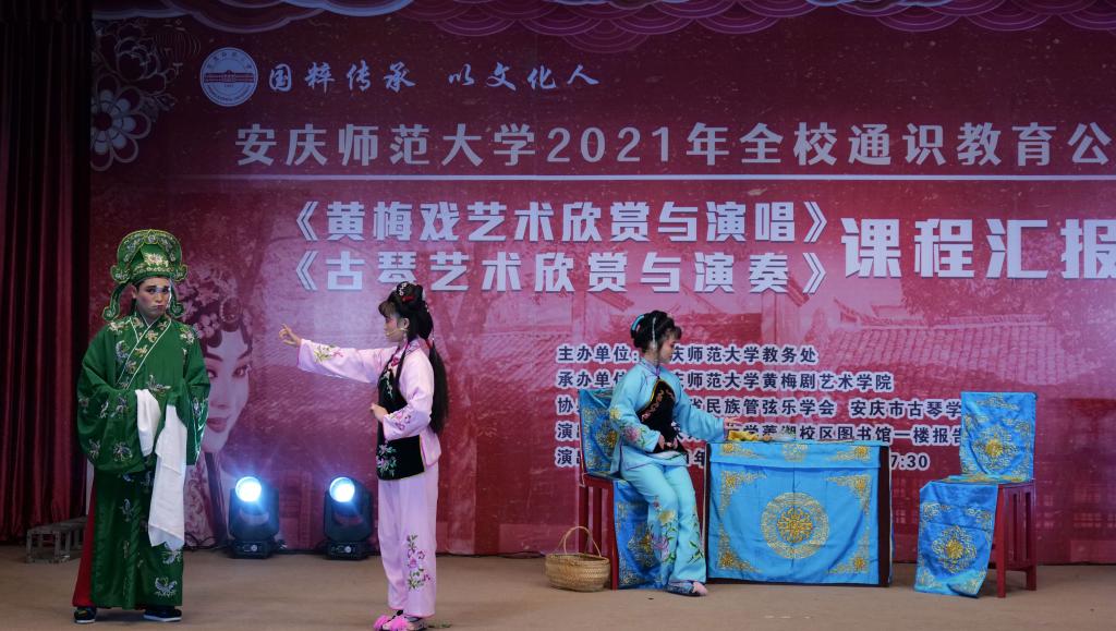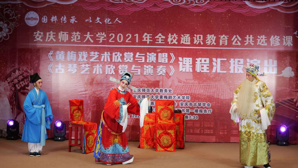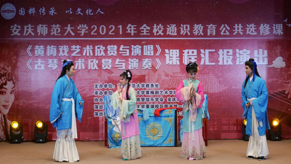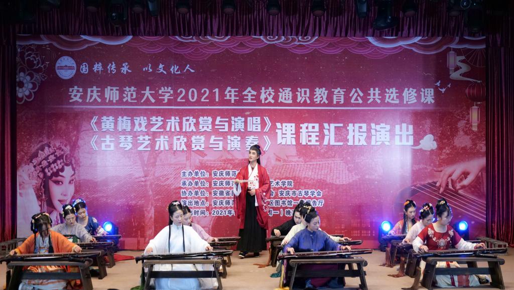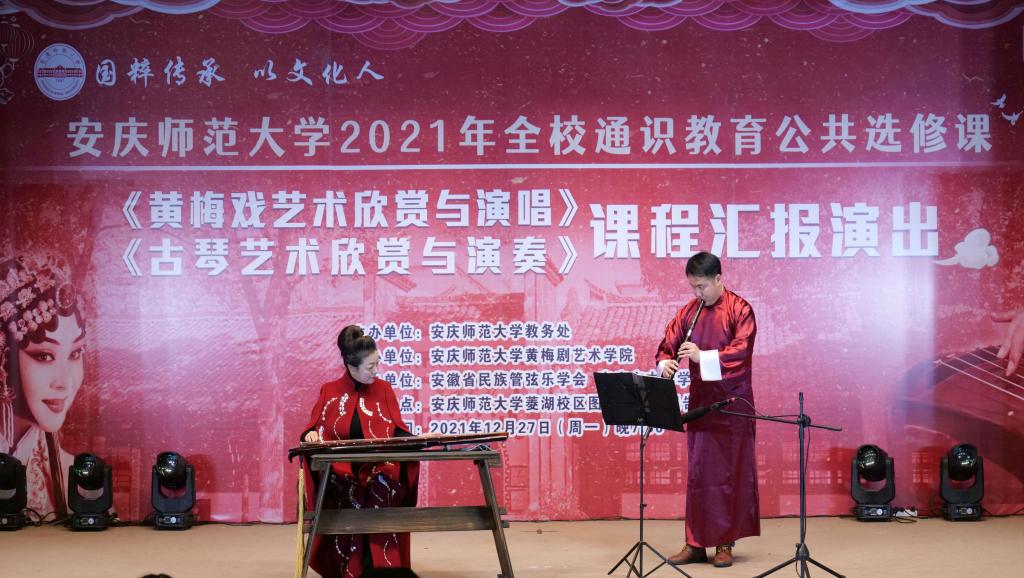 12月27日,全校通识教育公共选修课《黄梅戏艺术欣赏与演唱》《古琴艺术欣赏与演奏》课程汇报演出在菱湖校区图书馆一楼报告厅举行。演出由教务处主办,黄梅剧艺术学院承办,安徽省民族管弦乐学会、安庆市古琴学会协办。教务处、黄梅剧艺术学院等相关部门负责人及学校师生代表200余人现场观看了演出。