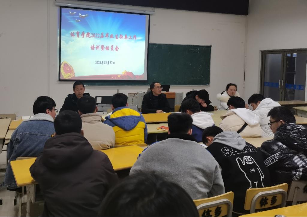 为进一步帮助广大毕业生了解征兵政策,激发毕业生参军报国的热情。12月27日,体育学院召开2022届毕业生征兵工作培训暨动员会。学院党委副书记高栋梁、毕业班辅导员和学院团委负责人出席会议,2020届毕业班男生参加会议。