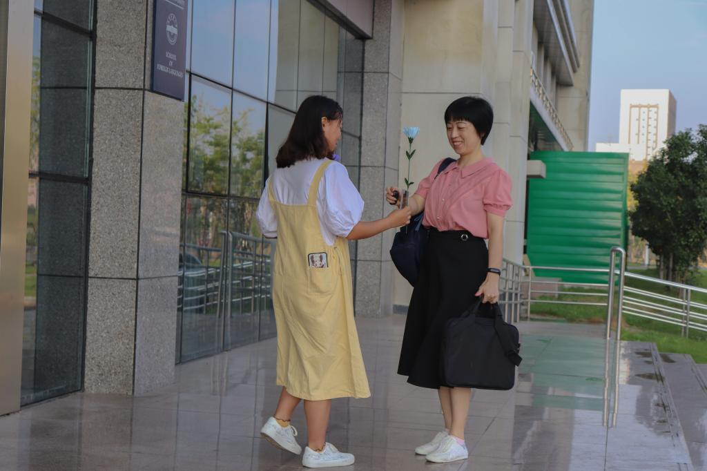 一支粉笔两袖清风,三尺讲台四季晴雨。在第37个教师节到来之际,外国语学院在9月10日上午举办“感谢师恩”主题活动。外院学子早早地来到了学院门口,将亲手书写的明信片和手工制做的康乃馨、玫瑰花送给前来上课的老师,并送上教师节祝福。