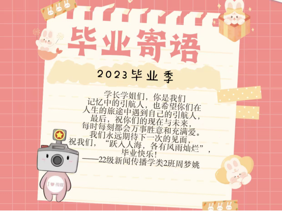 “希望你们在人生的旅途中遇到自己的引航人,祝你们的现在与未来每时每刻都会万事胜意和充满爱,毕业快乐!” 新闻传播学类专业2022(2)班的周梦姚希望自己真诚的祝福,可以给毕业生们带去温暖与喜悦。对于周梦姚来说,“毕业”尚且是一个遥远的词汇,但她想到了在学校的这一年里,受到许多来自学长学姐的帮助,因此她认真地写下了寄语,希望学长学姐能够前途似锦,也希望其他学生们对未来生活抱有憧憬和向往,接续奋斗。