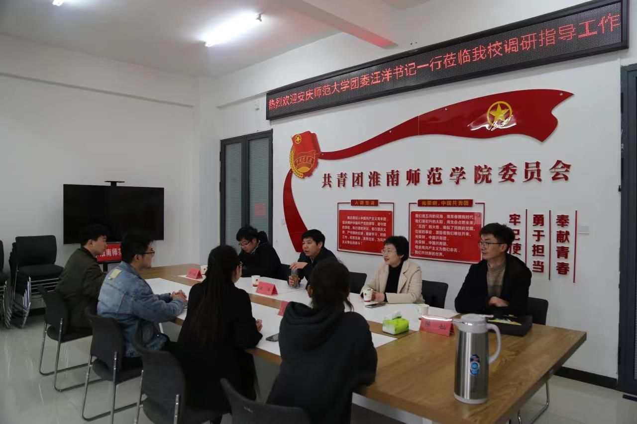 安徽理工大学团委书记程秀霞、淮南师范学院团委书记笪良国热情接待了beat365官网一行。两校团委负责人介绍了本校共青团工作开展情况,双方重点围绕创新创业教育、公共艺术教育、共青团促进就业等方面工作进行了深入交流研讨。