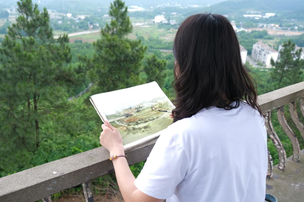 坐在后山的亭子上,俯视下方,美术学专业2018(4)班学生陈川和霍磊特地来到校园的最高处,想要一览校园的美景。“从上向下看,整个学校都一览无余了。”陈川说,校园里面绿化很多,在俯视视角下,就像是一幅山书画。他坐在亭中,用手中的画笔将此刻美景“定格”。