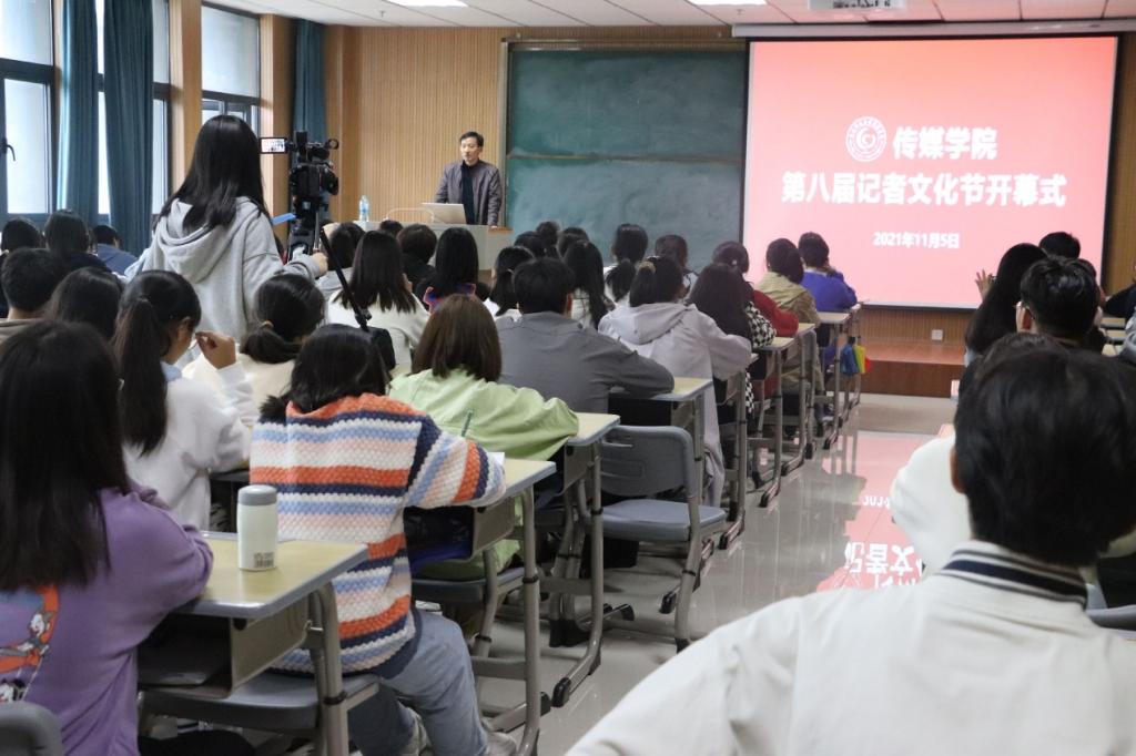11月8日下午,传媒学院在K505教室举办第八届记者文化节开幕式。学院党委副书记张万茂、副院长王业明、团委负责人以及学生会成员和2021级学生代表参加了开幕式。