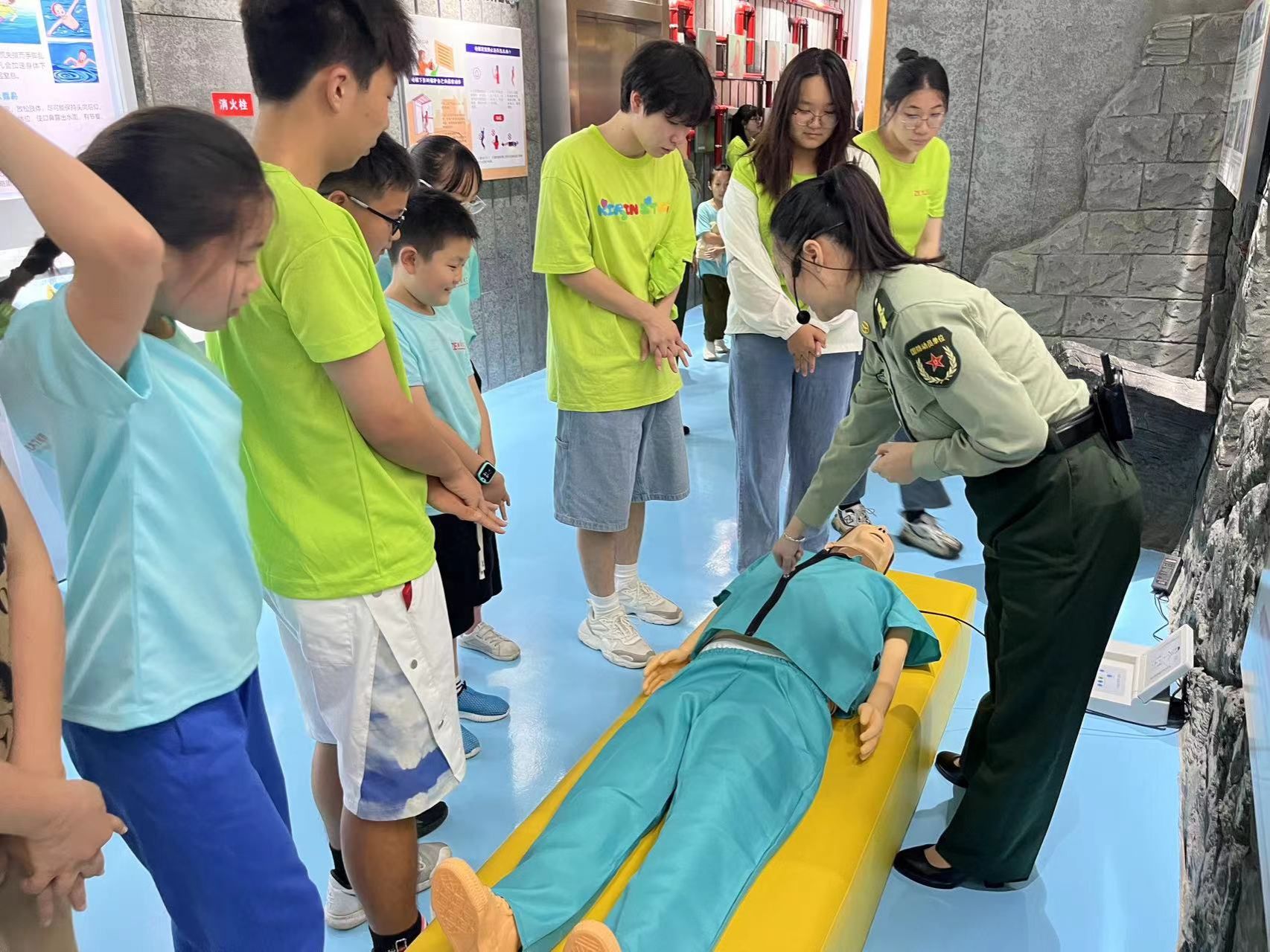 在模拟实践体验中,讲解员还向同学们传授了防空袭斗争和各种应急状态下的自救自护安全常识,并以问促思,以答促知,让学生们进一步加深对人防知识的了解,鼓励学生积极学习人民防空基本常识。在“防灾应急·共建民防”展区,学生们积极发言,主动询问,工作人员也为学生们进行耐心解答,帮助学生更好的了解和掌握火灾逃生技巧、灭火器的使用方法、心脏复苏急救方法等防灾应急知识。