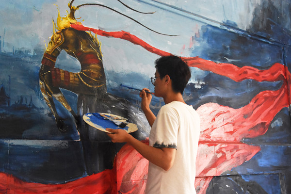 两个经过改造后的教室风格各不相同,改造过程中都遇到了一些困难。“我们教室后面的整个墙体绘制的是大圣归来的图案,这幅画是整个教室改造花费精力最多的地方,气温高,颜料干得很快,所以调色难度加大了。”环境艺术设计专业2015(2)班的霍兴伟说。