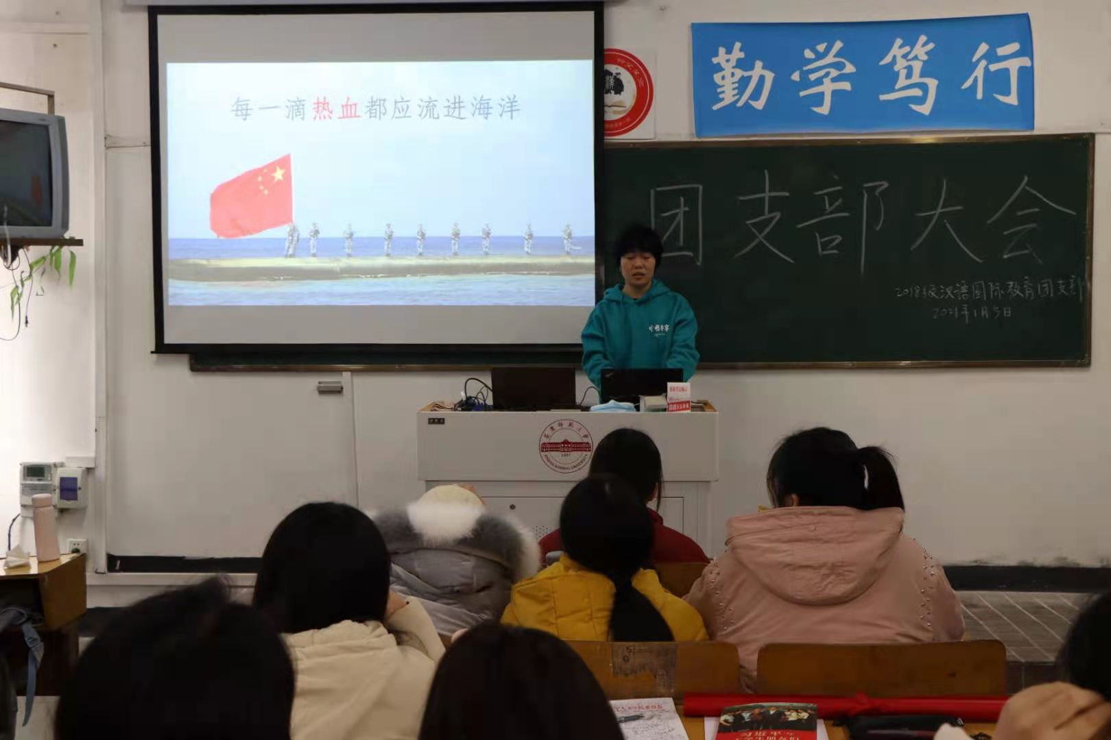 “热烈欢迎人文学院2018级汉语国际教育专业王梦雅同学光荣退伍!”在菱湖校区教学楼310教室,汉语国际教育专业2018级的学生们举办了一场特殊的欢迎会,欢迎刚从南海舰队退伍的王梦雅同学。