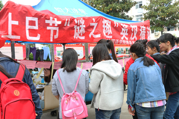 来自14级英语合作专业一班的金文婧同学是这次活动的负责人,她说:“这次字谜中不光有汉语字谜,还有英语字谜。这是我们结合专业的一次创新,很多同学觉得英语字谜很新鲜。”金文婧介绍,活动除了猜英文字谜外,宣传传统节日上巳节也是一个重要目标。“我们的微信公众号已经发布了关于上巳节的内容,大家来参加活动,即使猜不出字谜,扫码了解上巳节也会有一份奖品的。活动是一方面,主要还是想让大家能在其中学一点东西,多了解一点传统文化,这样我们的目的也就达到了。”她说。
