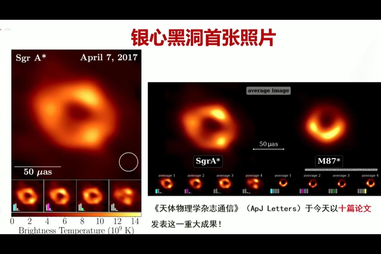 本次发布会公布了的本星系银河系的中心超大质量黑洞——人马座A*(Sagittarius A*,简写为Sgr A*)的照片,这张照片是继事件视界望远镜3年前发布的M87*黑洞照片后又一突破性成果。(事件视界望远镜,英语:Event Horizon Telescope,缩写为EHT。EHT是一个以观测星系中心超大质量黑洞为主要目标的虚拟望远镜天文合作组织。EHT以甚长基线干涉技术(VLBI)结合世界各地的射电望远镜,借助分布在世界多地的8个射电望远镜联合观测同一目标源并记录下数据,形成口径等效于地球直径的虚拟望远镜,将望远镜的角分辨率提升至足以观测事件视界尺度结构的程度。)