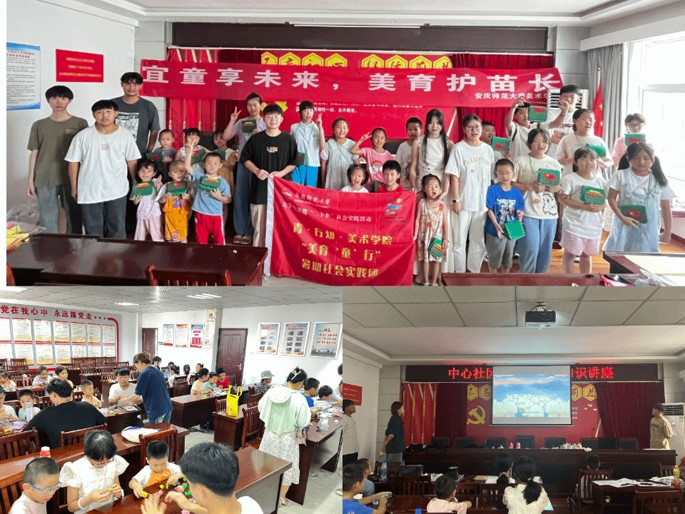 近日,美术学院青•行知“美育‘童’行”暑期社会实践团前往安庆市宜秀区大龙山镇中心社区开展暑期“三下乡”社会实践活动,团队成员立足学科专业特色,将红色文化与艺术相结合,开设系列暑期艺术课堂,带领社区近30余名儿童感悟艺术魅力,传承红色基因和优秀传统文化。