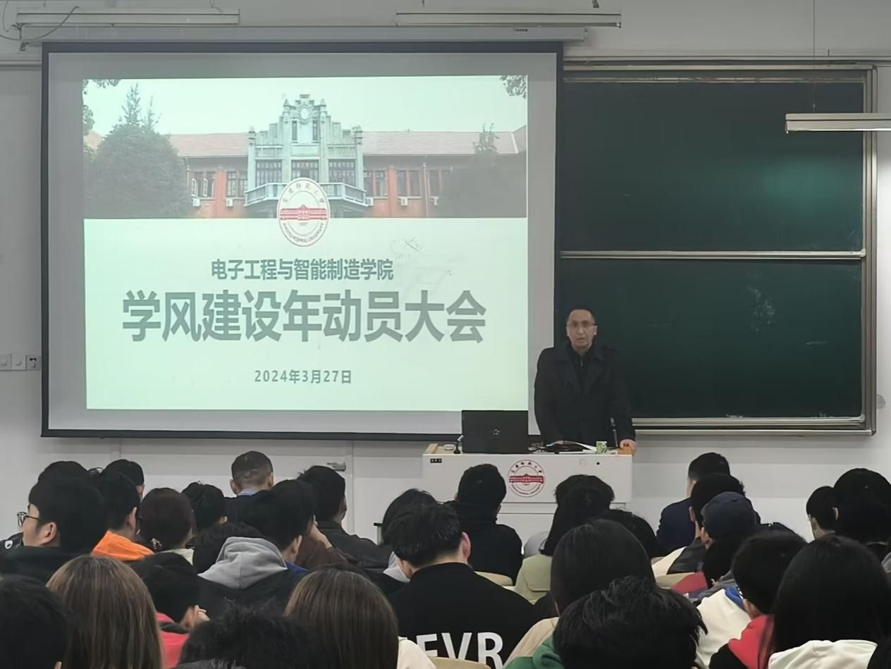 3月27日,电子工程与智能制造学院在稼先楼南100教室召开2024年学风建设年动员大会。学院党委副书记高栋梁出席动员会,教师代表、全体辅导员老师及各年级学生代表共200余人参加会议。