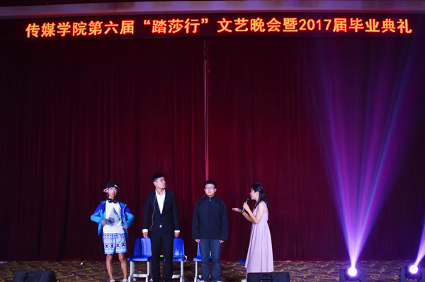 “不会忘记辩论赛中的激情雄辩和社团活动的忙碌奔走,不会忘记图书馆一楼的奋笔疾书和田径场上整齐划一的太极......”由2017届毕业生代表表演的开场朗诵《那四年光阴》拉开了晚会的序幕。台下观众区响起阵阵掌声和叫好声:“你们是最棒的,加油!”小品《80 90 00》用幽默风趣的语言讲述了三代人的生活故事;歌曲串烧《我们的明天》《身骑白马》《纪念》用歌声寄托了对毕业生的祝福;情景剧《你经历过毕业吗》用吐露心声的方式表达了对毕业的不舍。
