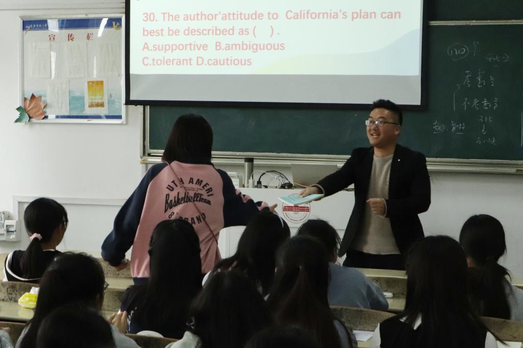 考虑到聆听讲座的学生来自不同年级、不同专业,该辅导员向学生分享四六级学习经验。化学专业2021级(4)班的王心如是拿到《四六级通关宝典》的“运气王”之一,她希望自己能真正掌握英语四六级通关秘诀,并为之努力奋斗。