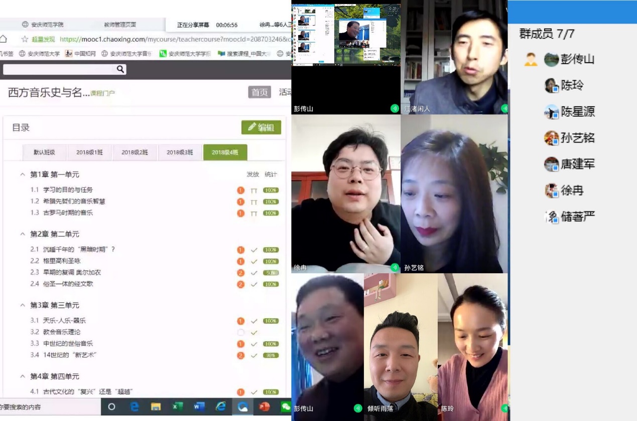 为了更好地总结和交流线上教学经验,提高线上教学质量和教学效果,4月8日下午,音乐学院理论教研室全体教师通过网络视频会议的形式开展了一次网络教学专题教研活动。陈玲、孙艺铭、彭传山三位老师分别介绍了自己的教学方法与心得。