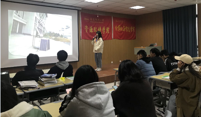 宣讲内容主要围绕节能减排大赛的赛事简介、赛事要求、往届风采和联系方式四个方面。资源环境学院“绿动未来”科创服务中心的工作人员围绕这四个方面向同学们做具体介绍。宣讲会以一个简短的介绍视频开始,通过视频的丰富内容吸引各位同学的注意,激发同学们的兴趣。接着,工作人员展开详细介绍,从赛事作品的分类,到作品的格式要求,再到历年的优秀作品展示和获得成果,多角度地向同学们展示此项赛事的魅力。宣讲结束后的自由提问环节,科创工作人员耐心地为同学们解答疑惑,帮助同学们清除心中对参赛的困惑。