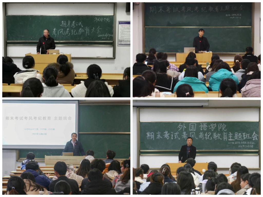 为严肃考纪端正考风,营造认真备考和诚信考试的浓厚氛围,近日,外国语学院各班级召开考风考纪教育主题班会,学院党委书记李亦亮、院长王先荣、副院长江加宏、黄全灿参加了主题班会。