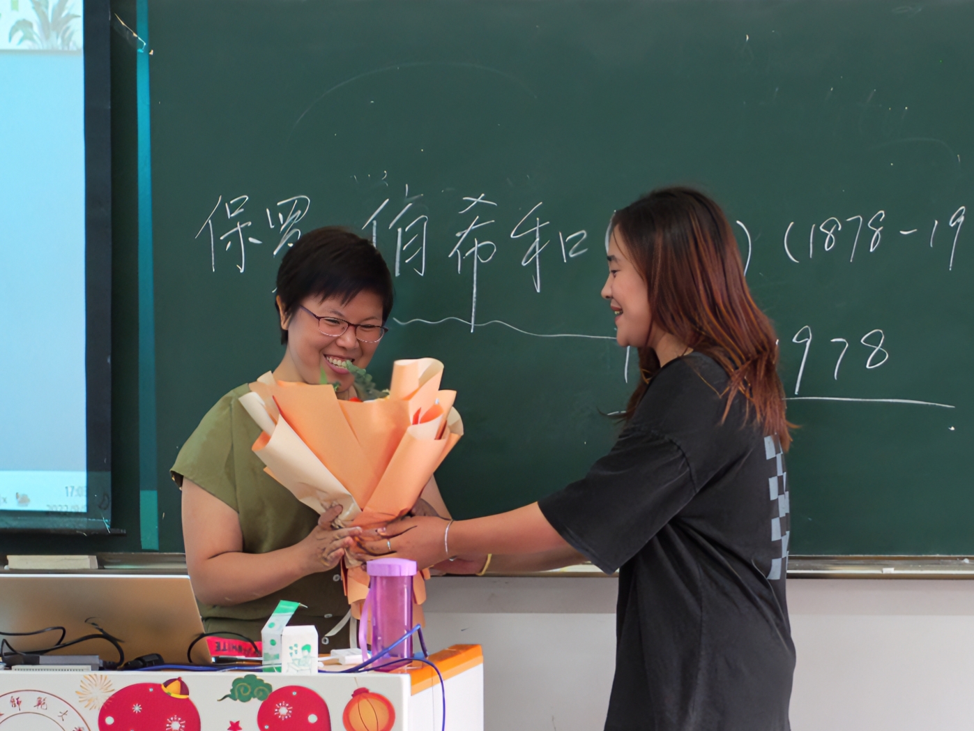 班长周雨情与班委和同学们商议后,一致决定赠送季艳老师教师节鲜花“回礼”,以感谢季艳老师平日对学生们的辛勤与付出。“季老师是一位非常认真负责的老师,我很喜欢她。”该班肖娴透露,季老师还担任了自己的本科导师,在担任导师期间,经常会为小组学生们收集一些有关汉语国际教育专业的考研试题和学习资料,并利用放学的空余时间为学生们仔细讲解,季老师也会贴心询问学生们有关生活或情感方面的问题,对学生们提出的疑惑作出耐心解答和帮助,“季老师从专业和生活上对我帮助很大,我们不仅是师生更是朋友,看到季老师就有一种踏实安心的感觉。”“这是我第三次为这个班级授课,为了庆祝这次‘重逢’,我为他们准备了初秋的糖果和奶茶。”季艳谈及送学生中秋礼物的原因,“收到同学们送的鲜花,我感到非常惊喜。”她表示,今年中秋节与教师节的日期重合,使自己和学生碰出了不一样的“火花”,这样的“双向奔赴”,缩短了师生的距离。“感谢学生们赠送的鲜花和他们的美好祝福,在往后的日子里,祝愿我的学生们步履不停、学业有成!”(撰稿:学生记者 汪瑞雪 摄影:学生记者 丁晓婉 编辑:范龙超 审核:赵丽丽)