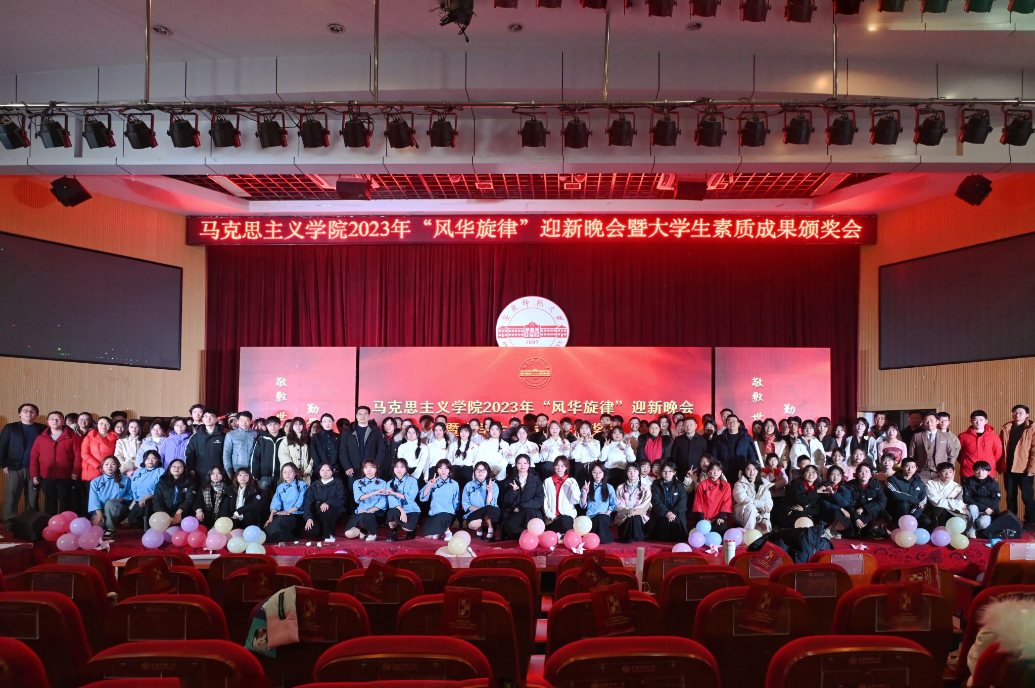 12月21日,马克思主义学院在图书馆东厅举办2023年“风华旋律”迎新晚会暨大学生素质成果颁奖会。学院院长严仍昱、党委副书记邹斌、副院长张俊生、教师代表和近300名学生一起参加了晚会。