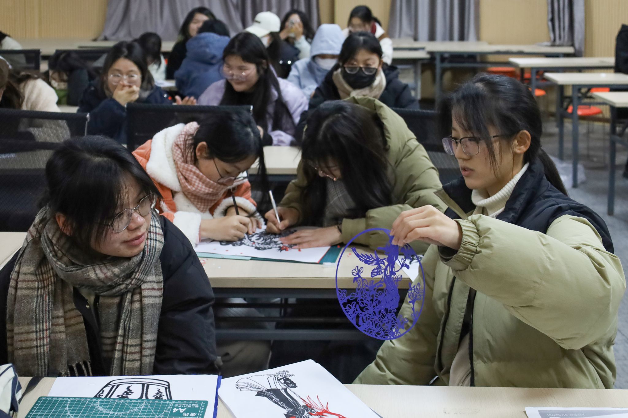 美术学院剪纸俱乐部创建于2018年,一直以来采用“传帮带”的形式,每周开设一次课程,每学期定期举办剪纸体验活动,让非遗剪纸文化一届届传承下去,为学校“湖畔艺术节”等艺术展览与公益义卖提供了众多剪纸艺术品。该院党委副书记金忠良表示,主题剪纸活动能让学生们在动手的过程中体验中国龙纹的美学魅力,希望非遗剪纸艺术“生活化”能让非遗文化的种子在校园的土壤生根发芽,创新美育在校园的传播模式,让更多大学生和非遗剪纸蕴含的审美内涵“相遇”。(撰稿:学生记者 罗佳琦 摄影:学生记者 王优菲 李武 编辑:江伟 审核:金忠良 赵丽丽)