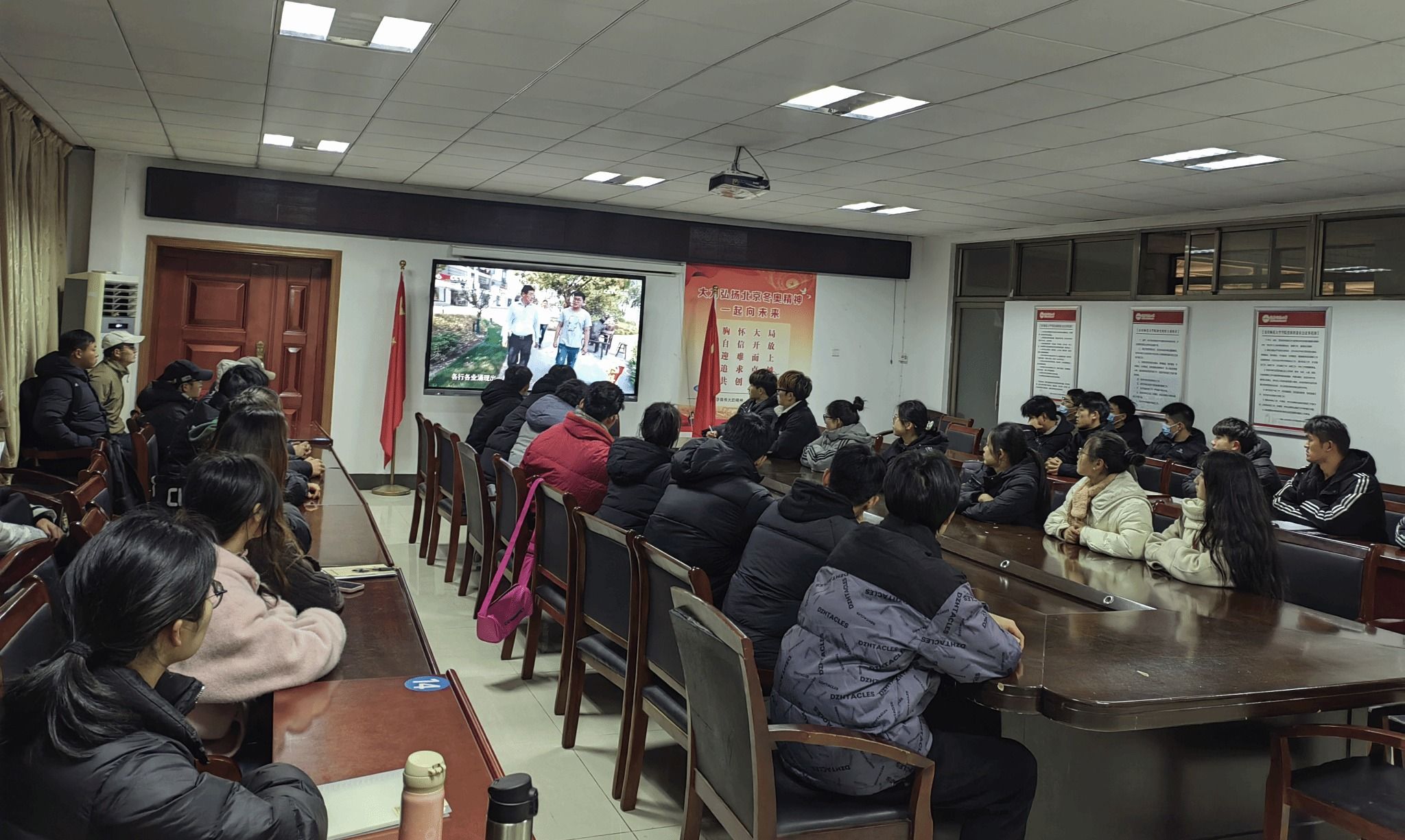 12月21日,体育学院积极组织学生党员、学生会成员在学院三楼会议室集中观看《榜样8》专题节目现场直播,各班级采取分散方式收听收看活动,感悟榜样精神,汲取奋进力量。