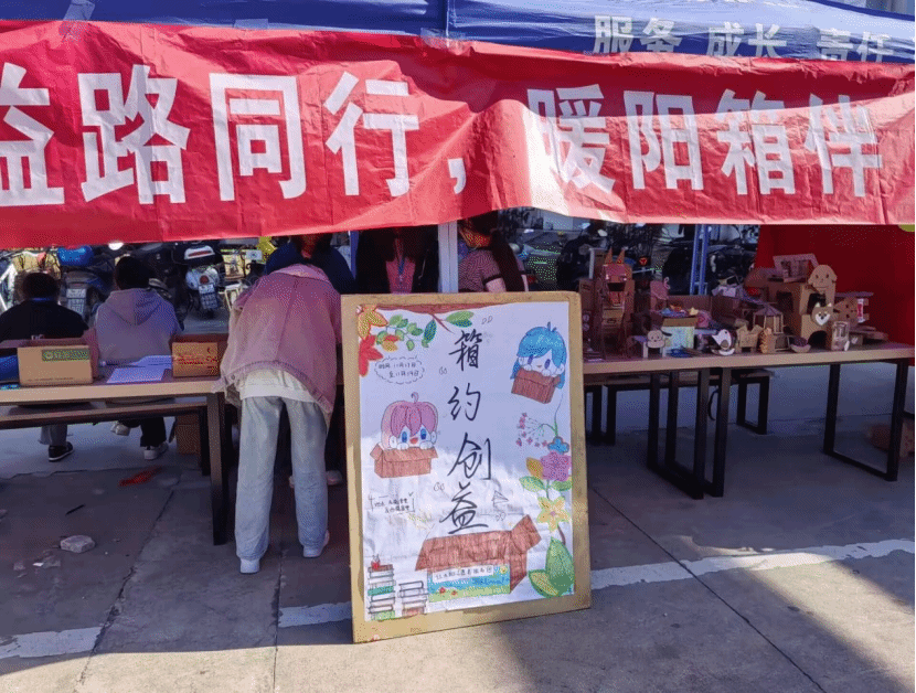 商讨活动细节、准备所需材料、布置活动现场,志愿服务团成员提前两周便开始策划部署。“一些看起来没用的废品,很可能是未曾发掘的宝藏。”服务团成员、环境工程与科学类专业2023(3)班的汪凯将活动展板放至规定处后又进入到桌面物品的归置中去。“我们会将制作精良的作品带给小朋友们,没有经过创作的纸箱会被收集起来卖到废品收购站,将获得的利润用来购买学习用品捐赠给一些小学。”他表示,将废旧纸箱通过DIY变成工艺制品,培养学生的创新思维,废品转卖也能够帮助他人,助力公益事业发展,是意义非凡的。
