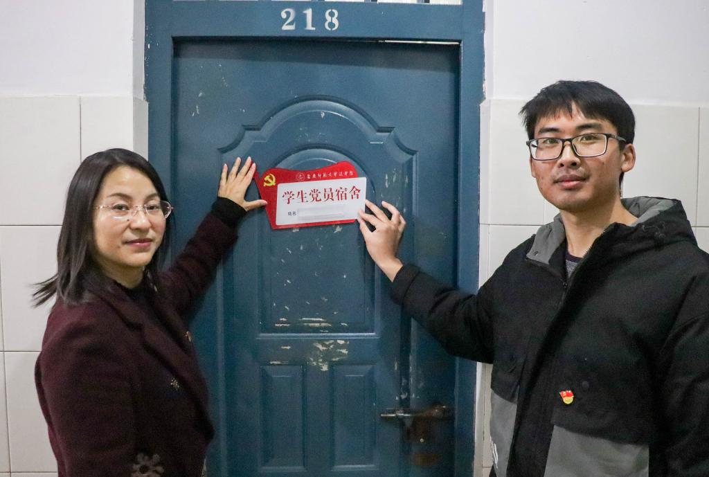 活动结束后,从光梅和党员服务站指导老师来到学生宿舍为党员宿舍挂牌。学生党员、法学专业2019级(4)班张翀正拿着手机,指导宿舍同学学习强国APP,“我很自豪我是一名中共预备党员。”他表示,“作为一名学生党员,我有义务带领班级其他学生学党史,在党的光辉历程中汲取智慧和力量。”(撰稿:学生记者 黄颖 摄影:学生记者 魏小婷 审核:从光梅)