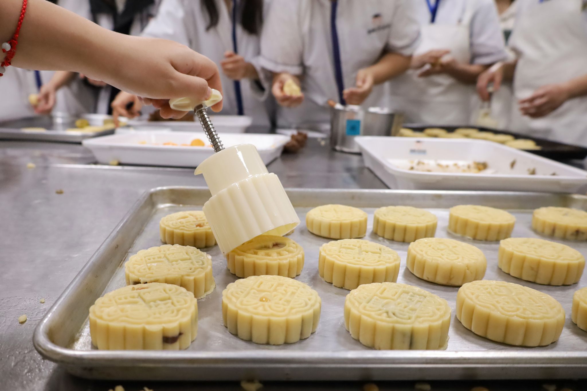 澄黄的咸蛋黄、软糯的莲蓉、香气扑鼻的肉松豆沙与椒盐五仁……一小时后,各种口味的手工月饼新鲜出炉。据食堂大厨介绍,月饼制作的最后一道工序是4至5天的放置回油,回油后的月饼软糯油润,中秋节当天便是它们的最佳赏味日。
