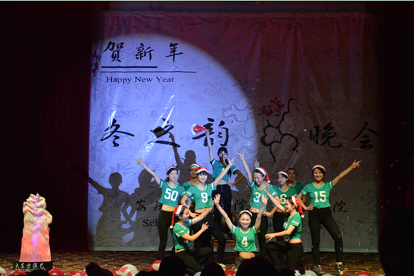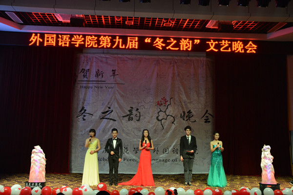 12月24日晚,外国语学院第九届“冬之韵”文艺晚会在龙山校区图书馆东报告厅举行。外国语学院党政班子及全体辅导员老师、外籍教师、部分教师代表到场,学院2014、2015级学生以及各兄弟学院学生代表共五百余人观看了晚会。