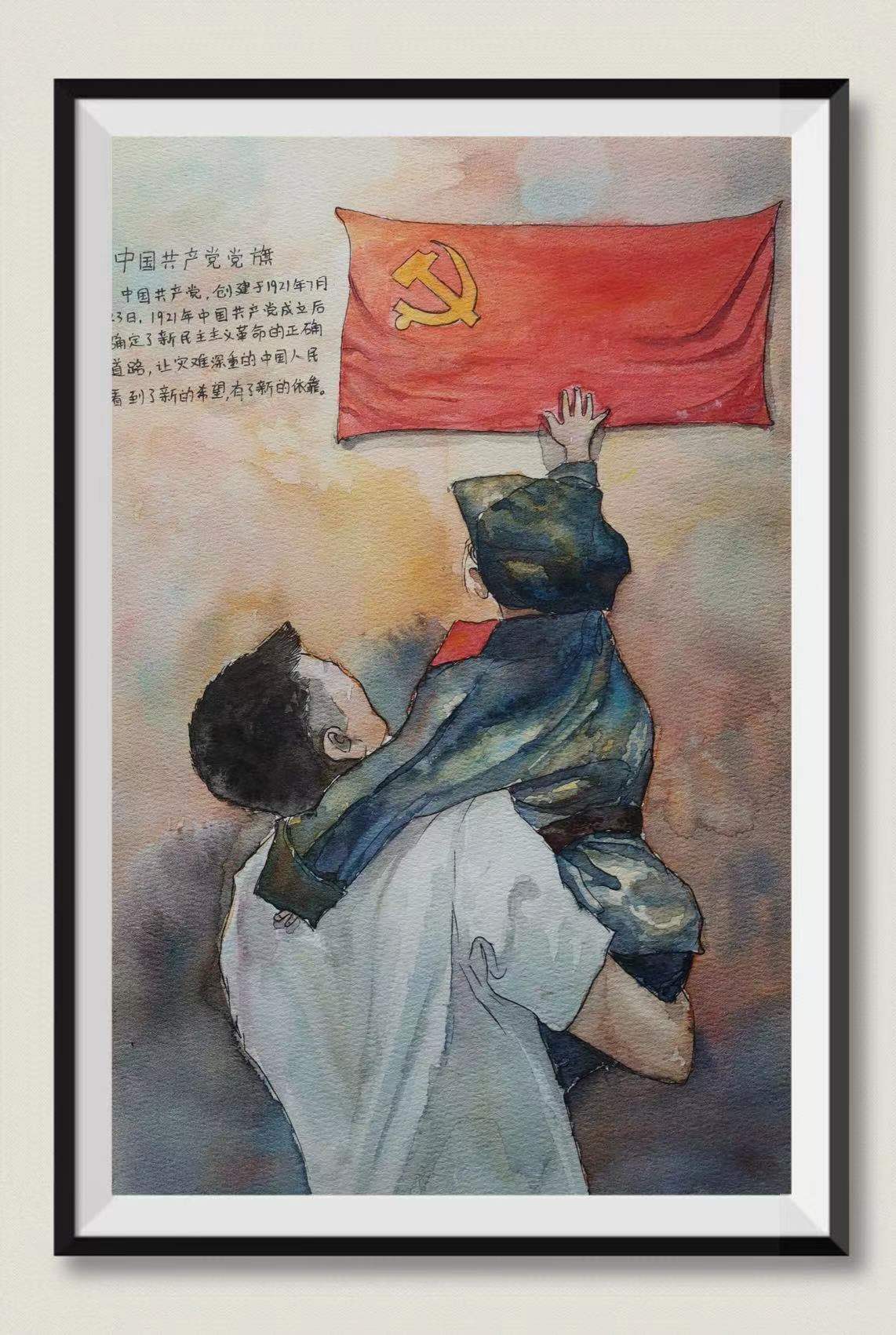 “父亲举起小女孩,小女孩将手伸向党旗,代表他们向往中国共产党,党拥护我们,我们也拥护党。”美术学专业2019(3)班的周海媚介绍着她的作品,她希望党史学习遍及更年轻一代,让中国共产党精神代代相传。作为一名入党积极分子,她表示自己在了解到革命先烈的奋斗故事后,就一直向往成为一名中国共产党员,并且在为之奋斗着。