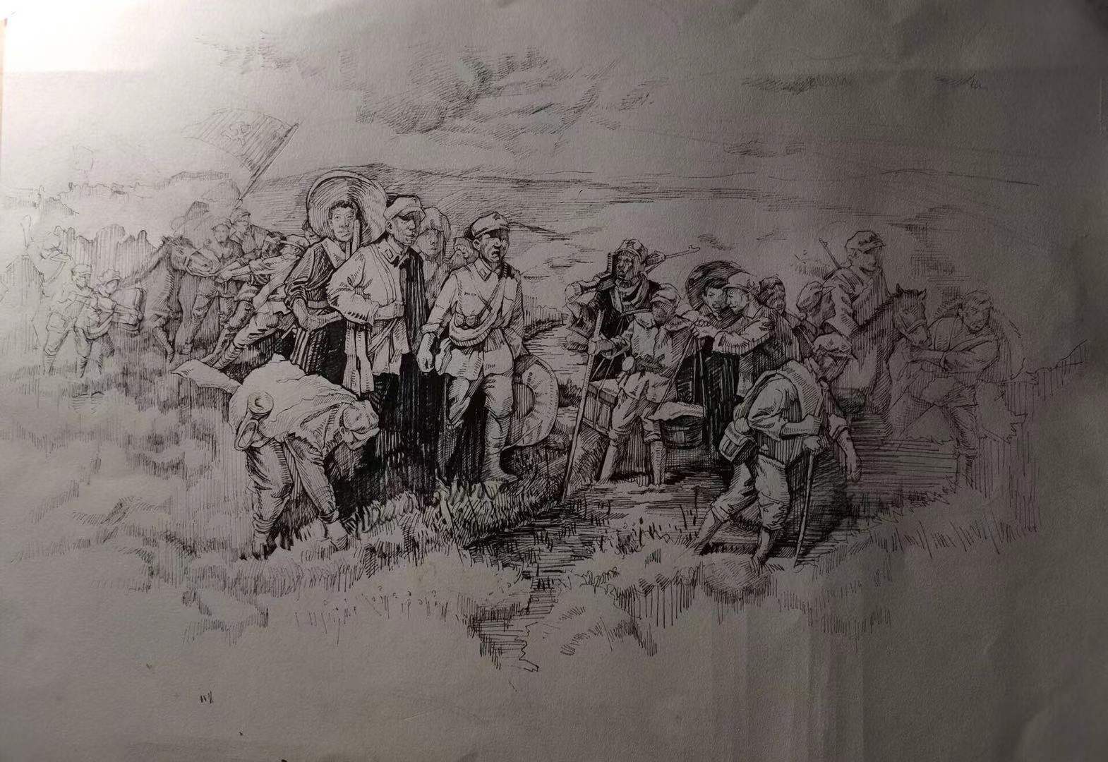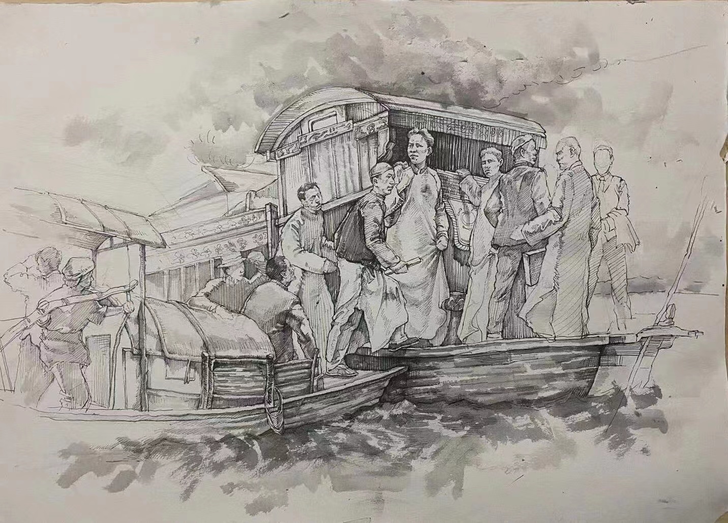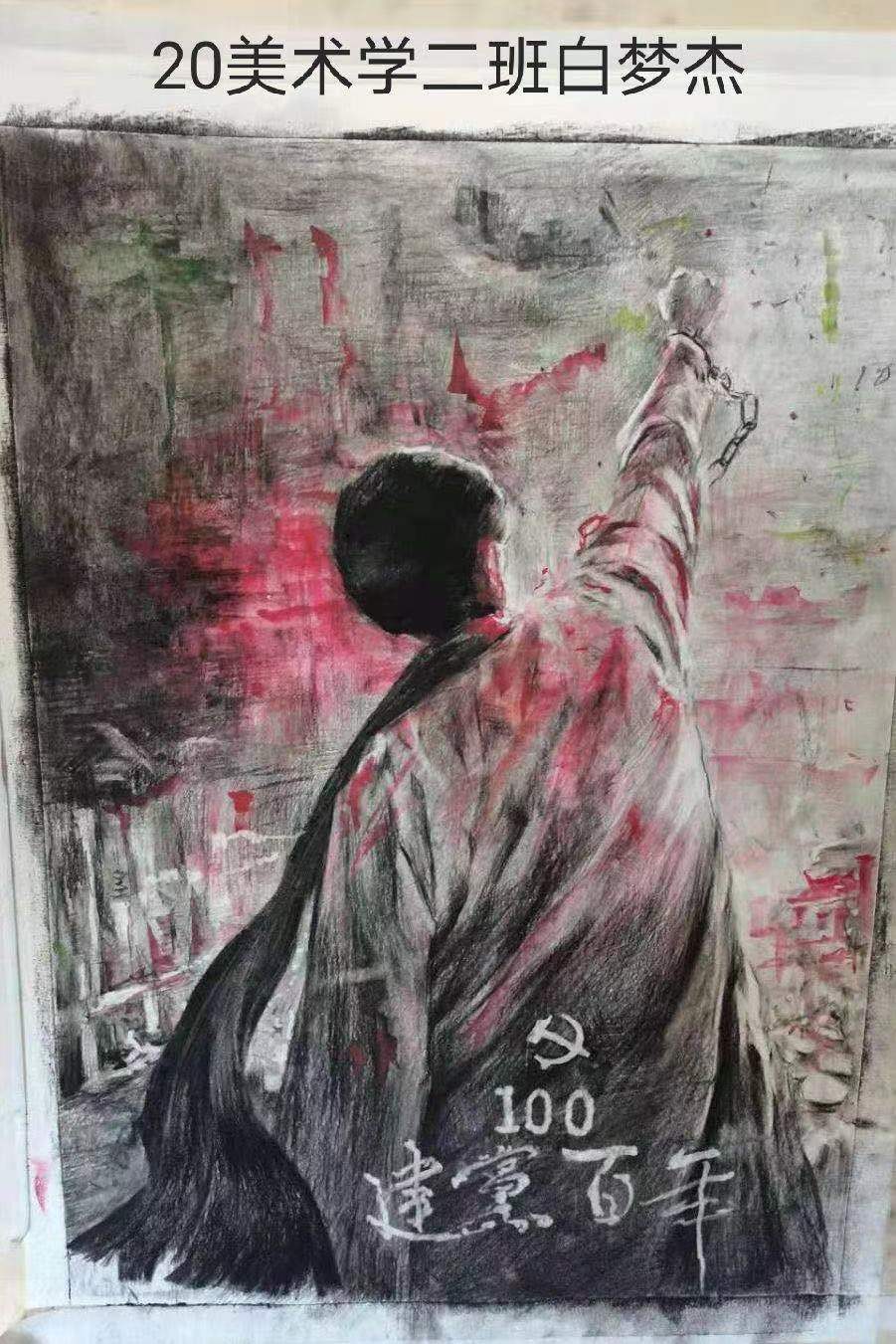 美术学专业2020(1)班的胡志豪在5月18日就完成了自己的作品,“作为一名积极入党分子,同时也是一名美术生,我愿意用画笔去纪念先辈,表达对先辈们的尊敬,将中国共产党精神传递给更多人。”他的作品《红船精神》中,伟人们或站在船头或者正迈步走上船,无惧四周风浪。他表示,自己要继承先辈精神,刻苦学习,用自己的专业为国家做出贡献。