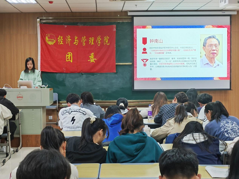 各小组代表分别和与会同学们分享新中国成立以来在各个领域做出突出贡献的杰出人物事迹,以及小组学员的个人心得。2021级工商管理专业学生方博雅介绍钟南山院士的父亲——儿科医学专家钟世藩致力于临床和实验研究,取得免疫单向扩散技术的事迹,方博雅说,“通过这次报告,让我也真正走进钟世藩教授,他的事迹不仅让我们感受到炽热的爱国热情,更是从中学习他严谨的工作态度和开拓进取的科学精神”。