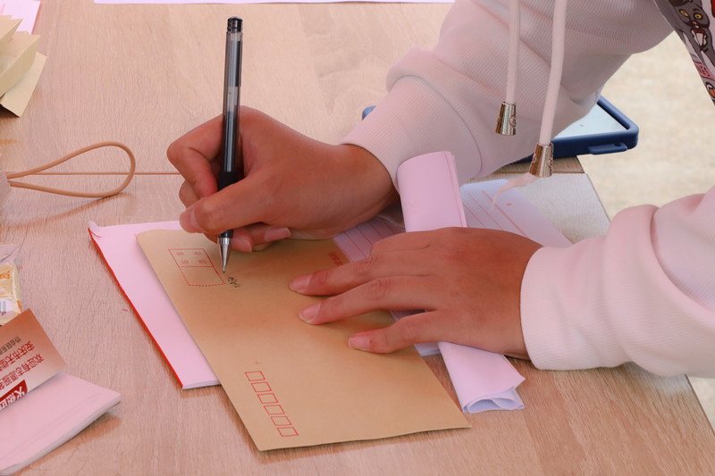 领取信纸,执笔写信,收好信纸,装填信封……前来写信的学生们在工作人员的指导下有条不紊地参与到活动当中。学生们或写下美好祝福,或传递春日温暖。一封封信件在封面上标明收信人的姓名与住址,工作人员则化身“飞鸟”,将这些信件一一送往学校的各个角落。