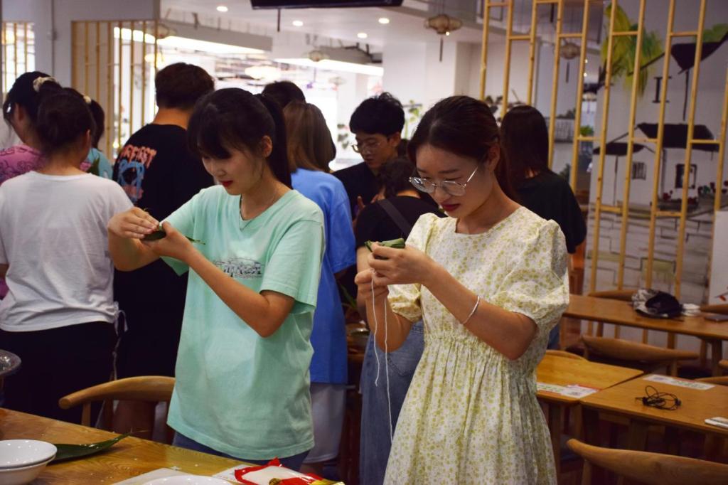 洗粽叶、舀糯米、拿馅料……活动现场,学生排队领取包粽子的食材后便分成小队,合作包粽子,他们将原料均分为几个碗装部分,围绕食堂餐桌一边包粽子,一边聊天谈心,分享包粽子的经验。还有不少学生拿出手机搜寻相关视频,学习各种“花式”包粽子的方法。不到半小时,半斤红枣、5斤糯米、180片粽叶等原料变成了50余个粽子。