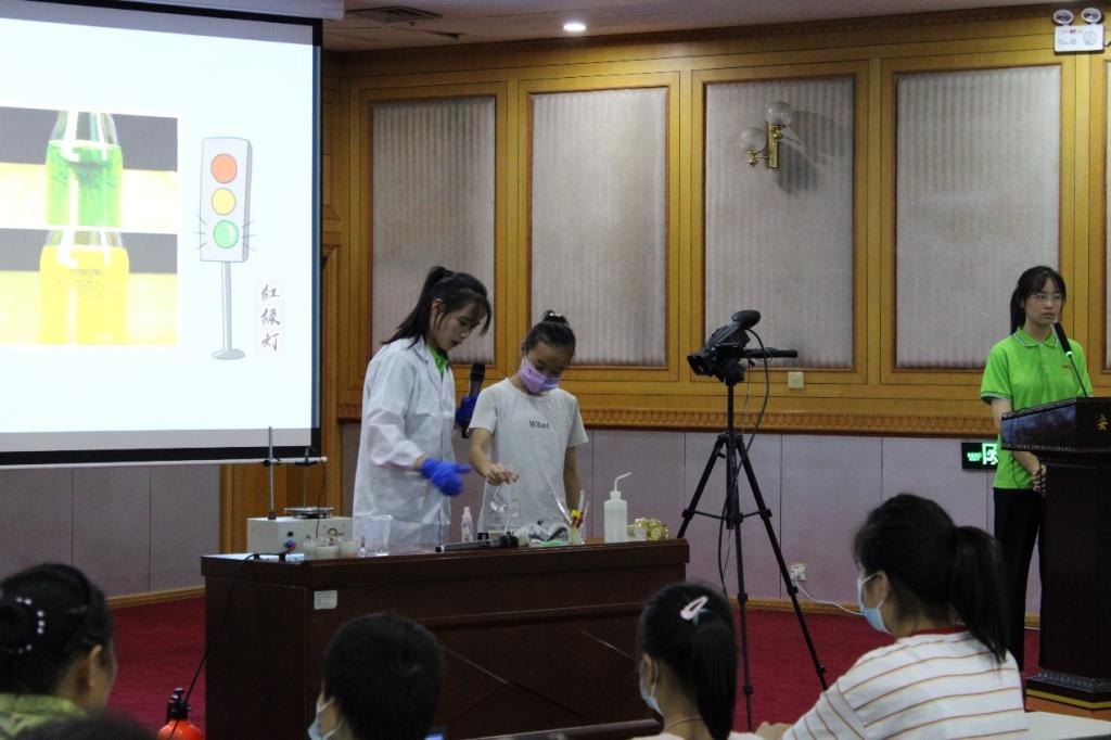 课堂上,团队成员为孩子们演示了“热冰艺术”“金色的海洋”“多彩的大象牙膏”“火焰掌”等富有趣味性和观赏性的科普化学实验,让孩子们体验到了多变的化学实验,感受到了化学里神奇的“魔法”。“水能开出花朵,还能浇灌出五彩冰雕”“瓶子中的液体通过不断振荡,能变幻出红绿灯的颜色”这些神奇的实验让孩子们兴奋不已,争先恐后发表着自己对化学科学的新认识。同学们还提出许多困惑自己的问题:“为什么这个冰块是有温度的?”“为什么老师的手中出现火却没有灼烧?”团队成员们耐心、热情地为孩子们答疑解惑。同时,还邀请现场的孩子们积极参与互动体验,一同解锁实验现象背后的科学原理。这次科普课堂向中小学生传播了科学思想,普及了化学知识,带领同学们领略了化学世界的魅力,受到家长和学生们的高度认可。通过这次活动培养了青少年学以致用、实践创新能力,增强了青少年对科学研究工作的兴趣,同时也增强了团队成员积极投身科普工作的信念。