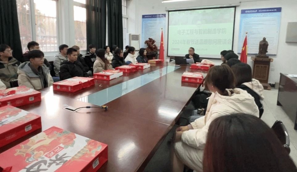 近日,电子工程与智能制造学院召开2024年元旦春节送温暖慰问座谈会。院党委副书记、纪委书记高栋梁、辅导员代表和资助专管老师出席慰问座谈会,学院省外家庭经济困难学生和少数民族学生参加慰问座谈。