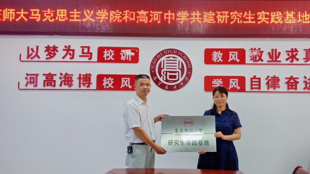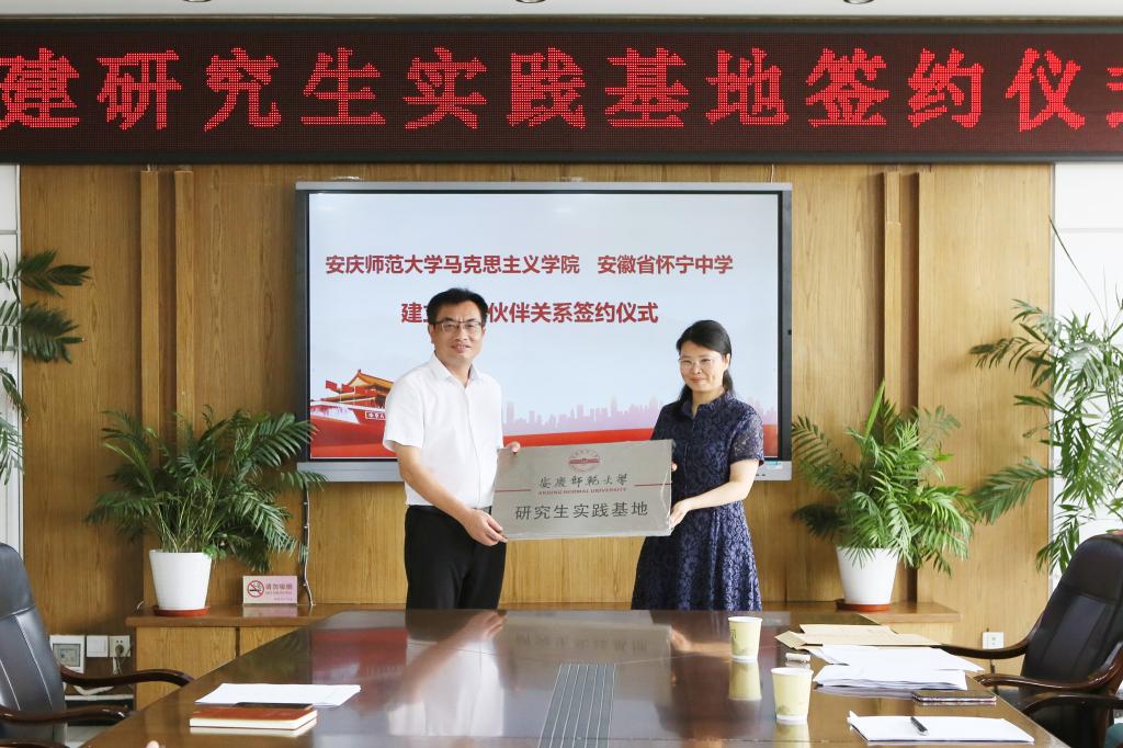 7月7日,马克思主义学院分别与怀宁中学和高河中学举行共建研究生实践教育基地签约仪式。马克思主义学院院长严仍昱、副院长张俊生,怀宁县教育局党委委员、副局长王根旺,怀宁中学校长程启进、副校长夏三五,高河中学校长操刘胜、副校长刘圣文等出席签约仪式。