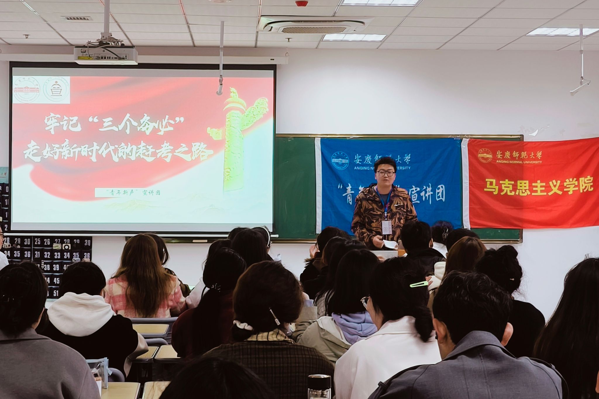 3月27日,“青年新声”宣讲团在Q楼308教室为马克思主义学院第四期“青马班”开展主题为“牢记‘三个务必’,走好新时代的赶考之路”和“以党的自我革命引领社会革命”的理论宣讲。马克思主义学院第四期青马班全体成员和第七期团校学员参加宣讲。