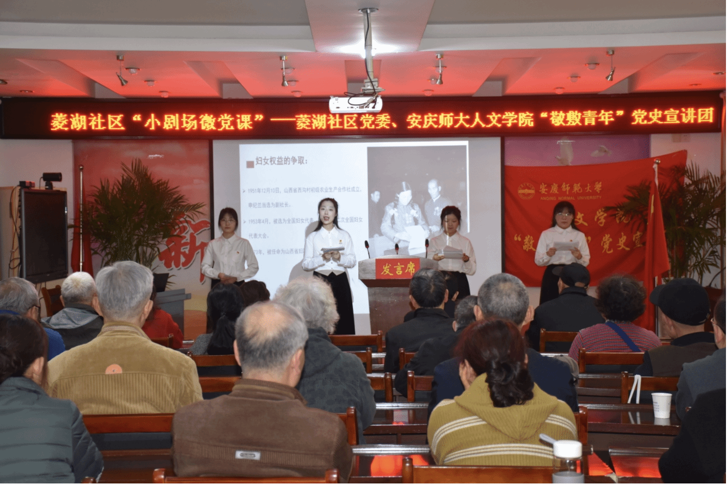 人文学院“敬敷青年”党史宣讲团的成员们向菱湖社区的老党员、退伍军人以及工作人员讲述了缪伯英、申纪兰两位女英雄的故事。宣讲团的成员们以满腔的热血生动形象地讲述了“宣传赤化的红党”缪伯英与“共和国勋章获得者”申纪兰两位杰出女性,凭借坚定的信仰与无私的奉献,书写她们辉煌的篇章。缪伯英与申纪兰,为了民族的兴衰存亡和人民的福祉,毅然踏上了奋斗拼搏的征程,努力为女性争取平等的权益。她们身上闪耀着的,是共产党员的坚定信念和崇高精神,是对国家和人民深厚情感的体现。