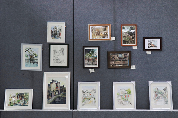 青砖、白瓦、马头墙……学生们将古色古香的徽派建筑通过绘画再现的方式,传达给每一个前来参观画展的人。“我们湖南也有类似的古建筑,但是我们的道路是木板路,而这里的路都是青石砖路。”国际经济与贸易专业2017级的曾燕表示她看了这么多好看的画,甚至想亲自去这些画里的地方看看。