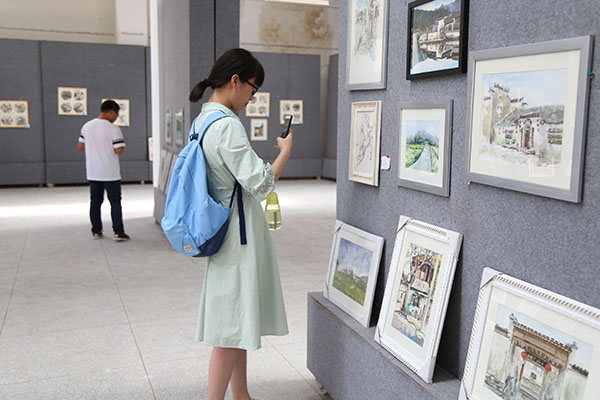 “从5月6日到5月20日,历时半个月的采风活动,我们去过宏村、屏山、芦村等地,这近百幅的绘画作品都是我们大一的学生画的。”动画专业2017级的李先俊说,虽然大家都是美术学院的同学,但是不同的专业侧重也有不同,动画专业喜欢用单纯的线条勾勒,而美术学专业则更加侧重于色彩的运用。