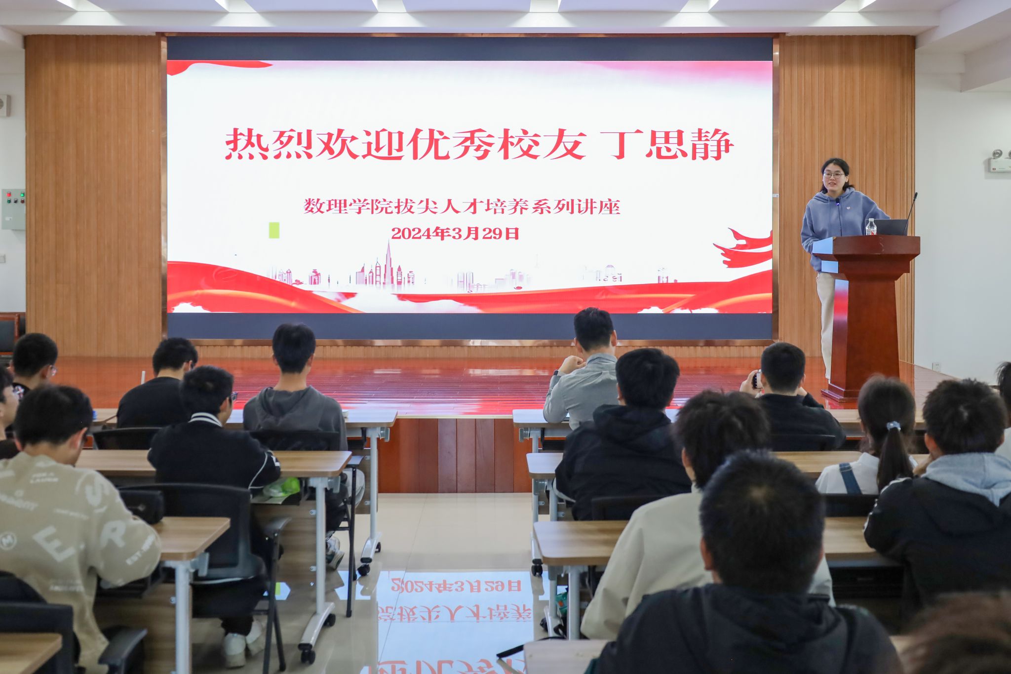3月29日,数理学院在401报告厅举办拔尖人才培养讲座。学院特邀请优秀校友、中国地质大学(武汉)物理系教授、博士生导师丁思静作经验分享。学院部分教师、4个稼先班学生和稼先班辅导员老师近100人参会。会议由学院党委副书记彭芳珍主持。
