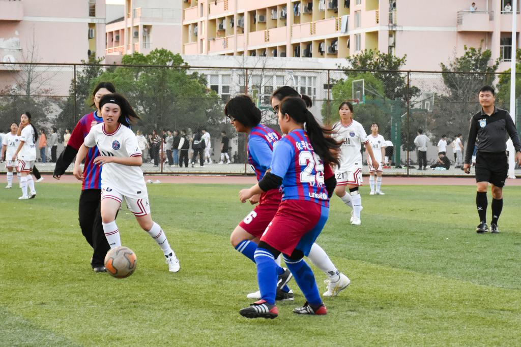 裁判一声哨响,红白相间的身影在绿茵场上奋力奔跑。正脚背运球、头顶球、拦截传球……随着比赛形势的变化,队员们攻守互换、相互配合,在赛场上调整自己的位置。场下观众呼声连连,不断向赛场上的女足队员们喊话,提醒她们注意“敌情”。