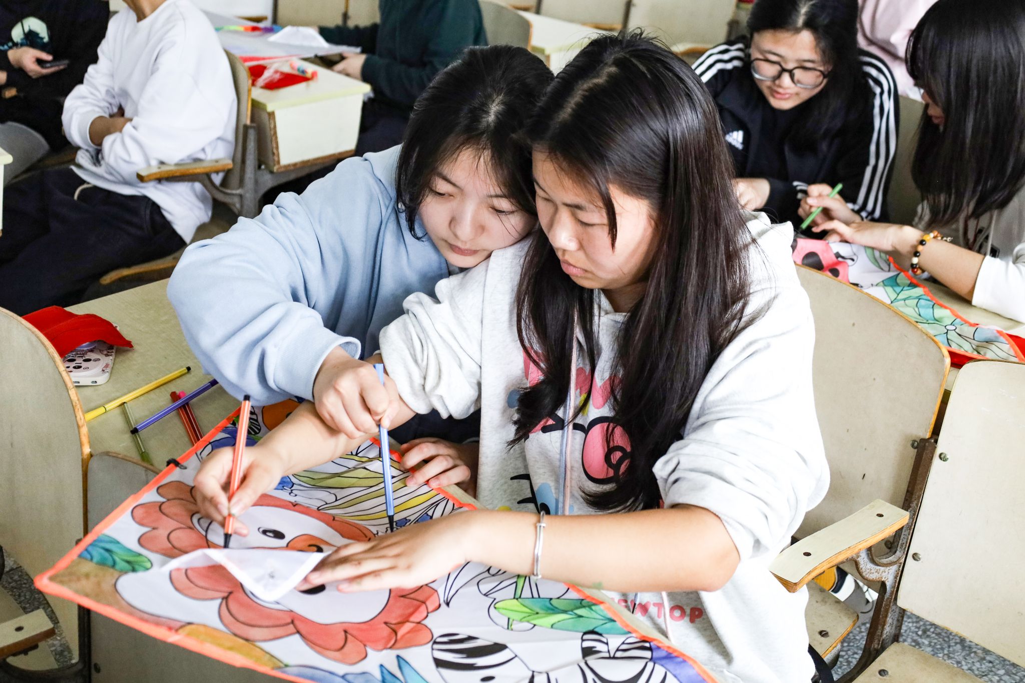 勾勒线稿、分区涂色,学生们经过一小时的绘制,陆续绘出了不同的图案。放松提线、迎风奔跑、腾空飞跃……15只风筝在空中高高飘扬。化学工程与工艺专业2022(1)班的沈怡然拿着她的风筝作品向同学展示。谈及活动感受,她表示,这次活动不仅有利于学生的心理健康发展,还提高了学生的审美能力和动手能力。