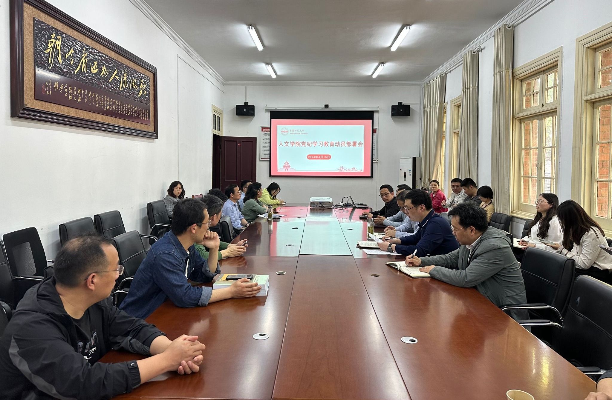4月15日,人文学院党委召开党纪学习教育动员部署会,深入学习贯彻习近平总书记关于党纪学习教育的重要讲话重要指示精神,传达学习《关于在全党开展党纪学习教育的通知》和学校动员部署会精神,研究部署学院党纪学习教育工作。党委副书记王波主持会议。学院党委领导班子,党支部书记、党员师生参加会议。
