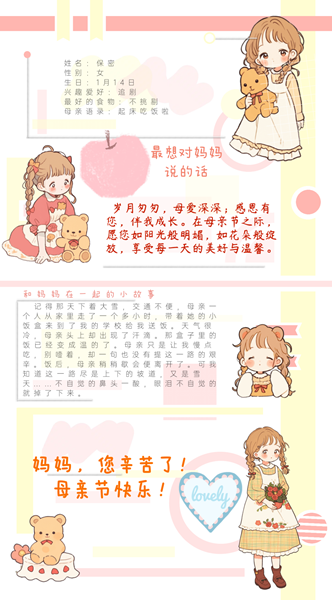 同学们精心制作了风格多样的亲情手账,有的清新自然,有的可爱浪漫,还有的以生动的表情包幽默地传达爱意。在这些手账中,同学们详细记录了与母亲的合照、和母亲共同经历过的趣事、学生对母亲的祝福、母亲的生日、母亲的爱好和喜欢的事物等内容,有的还附上了如“岁月匆匆,母爱深深;感恩有您,伴我成长”等温馨的祝福语,表达自己对母亲的感激和爱意。