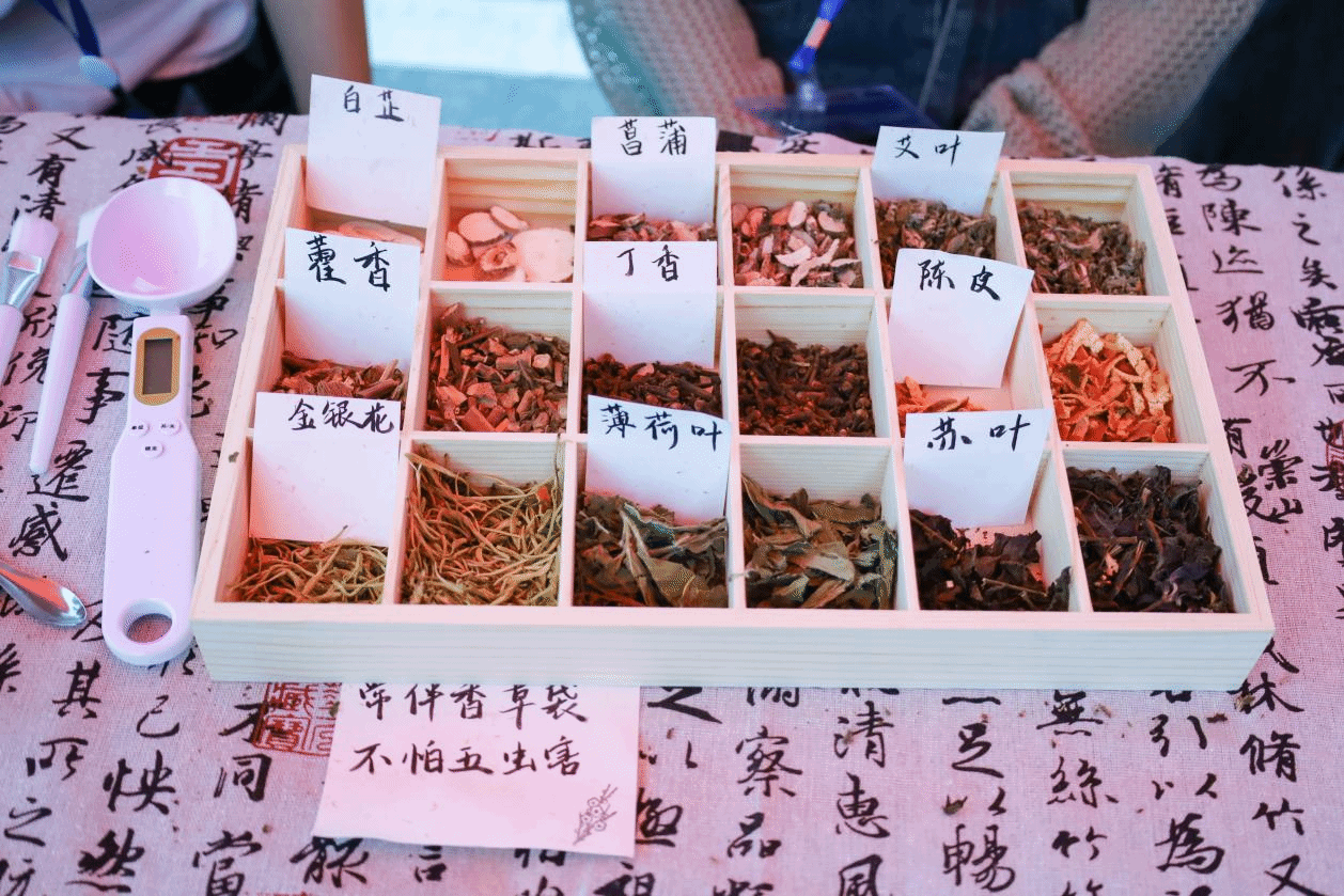 取丁香15克、薄荷20克、艾叶15克、藿香10克放入石臼中捣碎,再将粉末装入香包中,一个带有户外驱蚊效果的草药香包便出现在制作学子手中。“我们购买中草药时特意选择了未被加工成粉末的原材料,希望为学生带来更直观的参与感。”范彦菲介绍。“亲手研磨体验感十足,自己研磨出的粉末也更天然。”了解到驱蚊香包制作后,外国语言文学类专业2023(7)班的陶亚楠直言,草药香包既能驱蚊还很美观,她玩到的同时也“赚”到了。